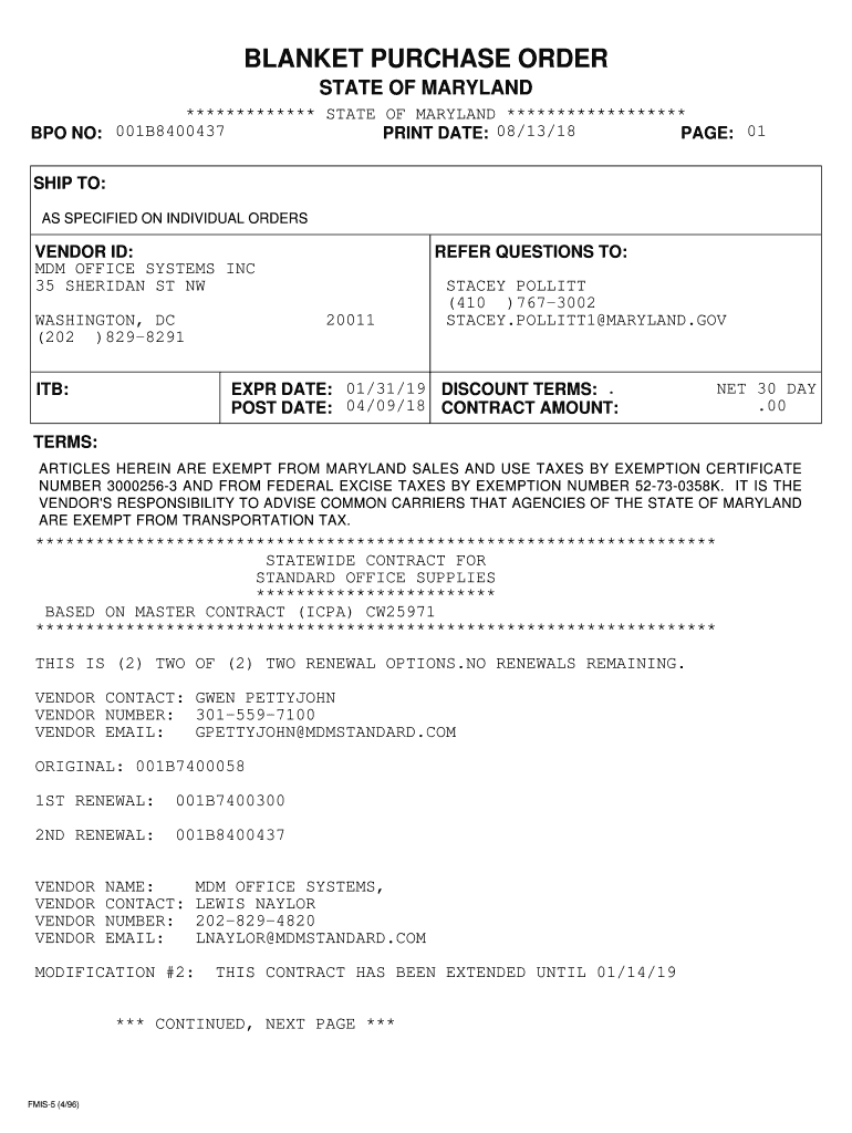 Get the free Blanket Purchase Orders - Maryland Department of ... - dgs maryland