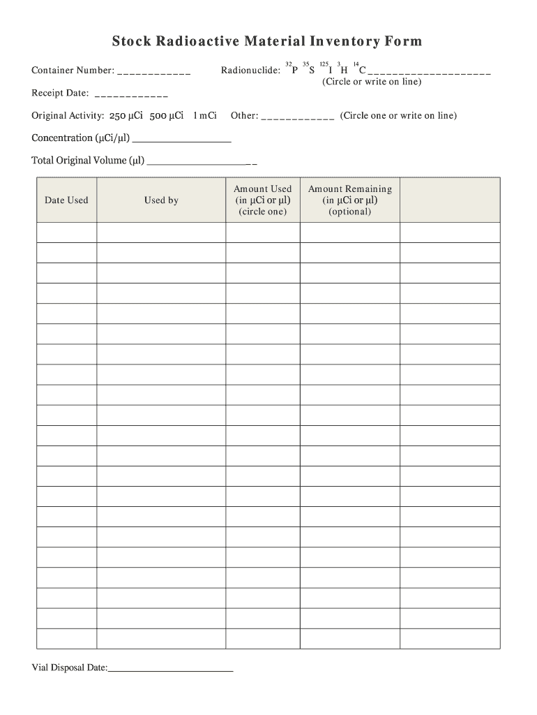 Stock Radioactive Material Inventory Form Container Number: Radionuclide:32P35S125314I H C (Circle or write online)Receipt Date: Original Activity: 250 Ci 500 Ci 1 mother: (Circle one or write online)Concentration