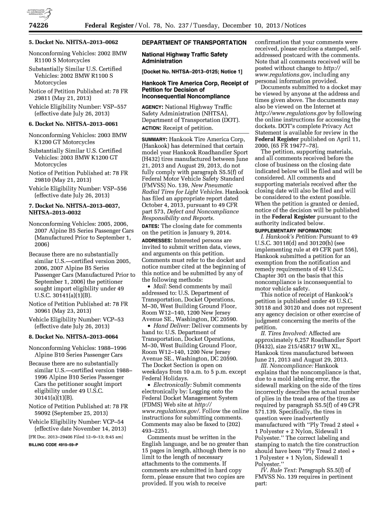 74226Federal Register / Vol. 78, No. 237 / Tuesday, December 10, 2013 / Notices5. Docket No. NHTSA20130062DEPARTMENT OF TRANSPORTATIONNonconforming Vehicles: 2002 BMW R1100 S Motorcycles Substantially
