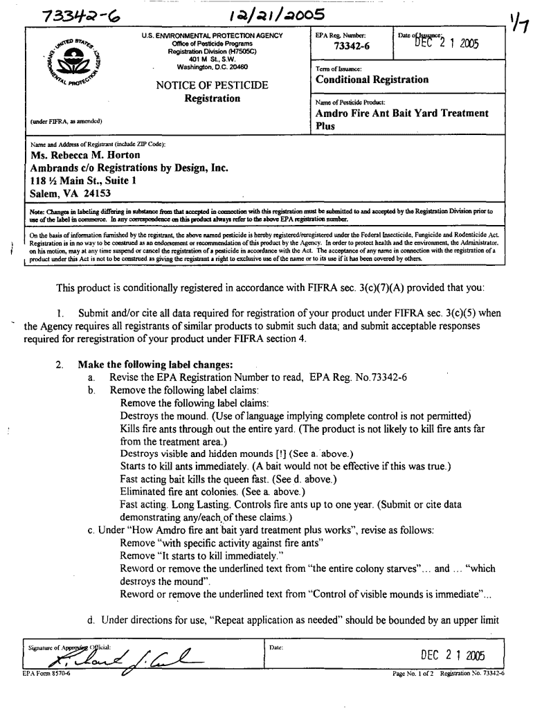 Washington, D, C. 20460W! Z.(CEPA Reg. Number:733426llilcoC21 2005Tenn oflssuancc:Conditional