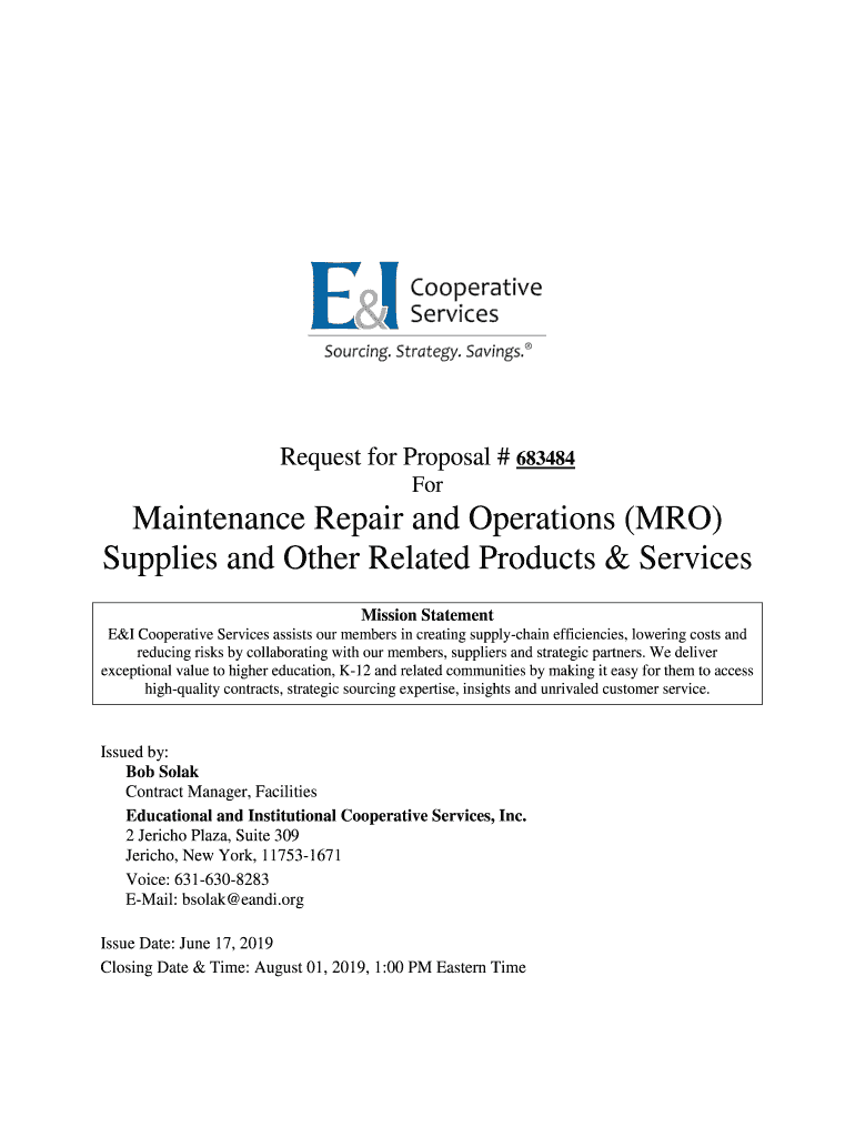 Request for Proposal # 683484 Maintenance Repair and Operations (MRO) Supplies and Other Related Products & Services Mission Statement E&I Cooperative Services assists our members in creating supply