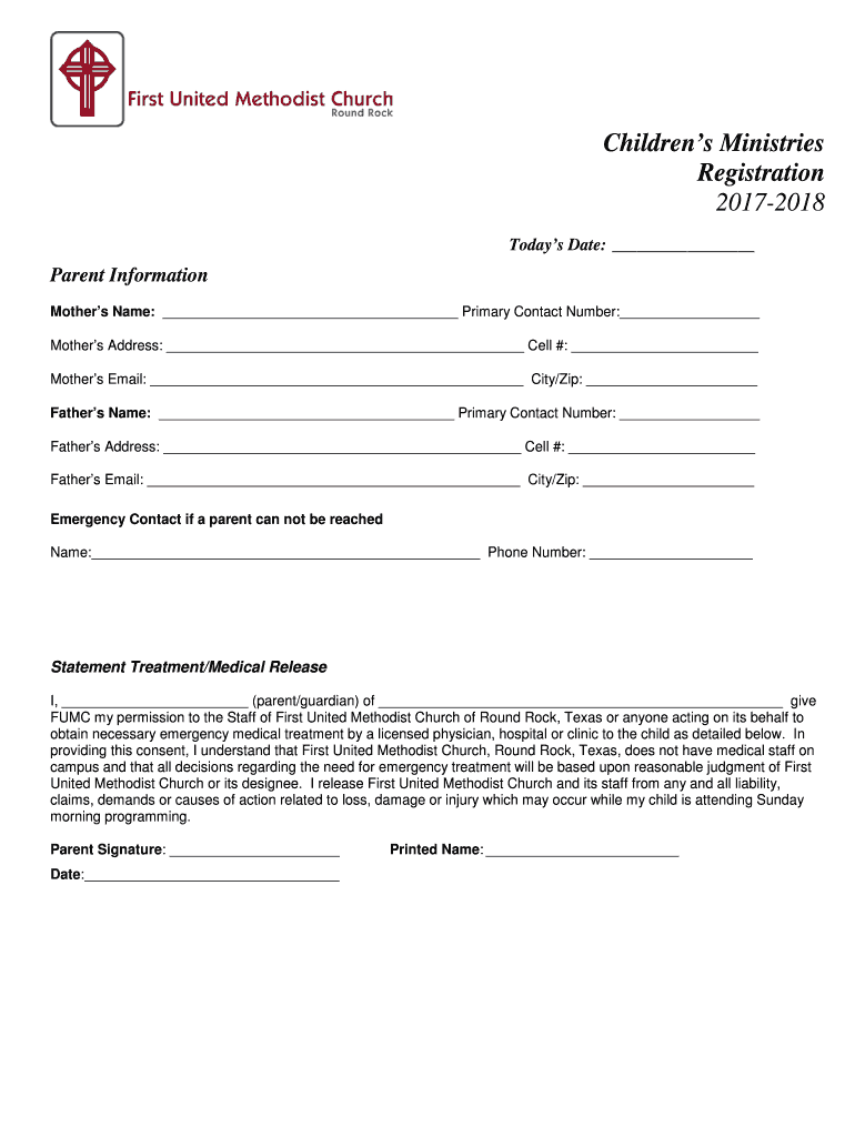 Children's Ministries Registration 20172018 Today's Date: Parent Information Mothers Name: Primary Contact Number: Mothers Address: Cell #: Mothers Email: City/Zip: Fathers Name: Primary Contact Number: