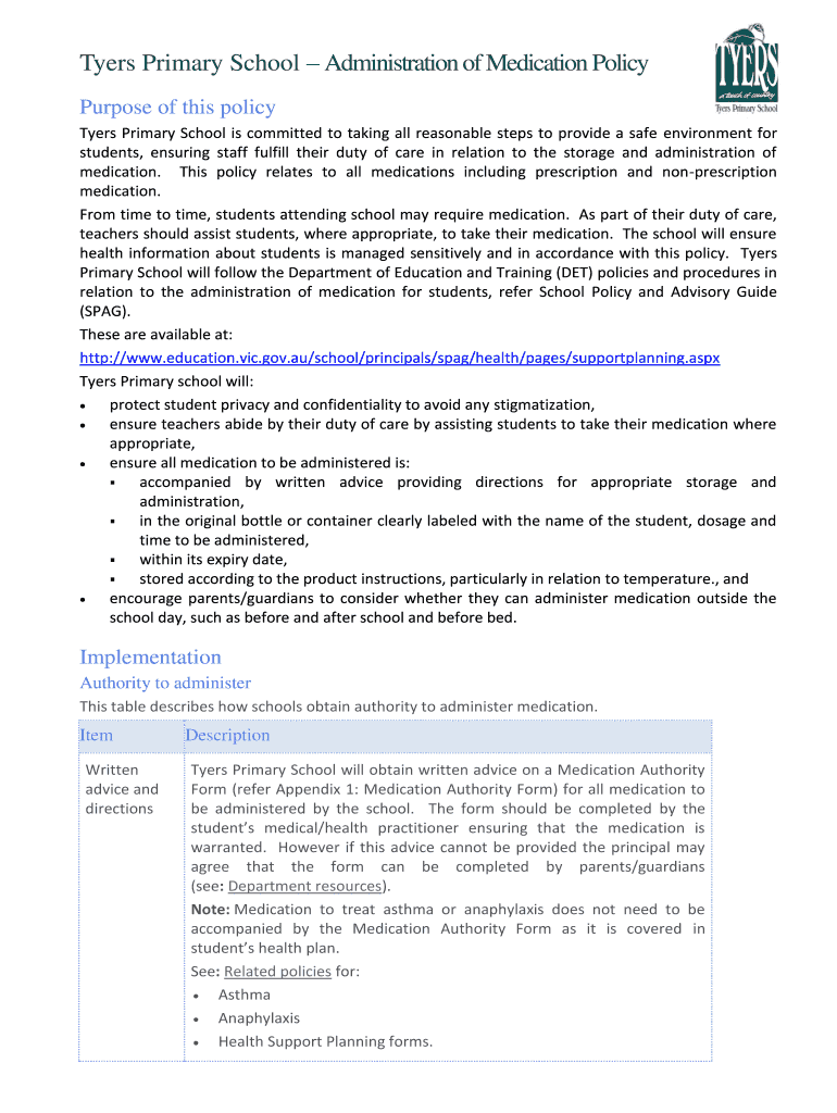 Myers Primary School Administration of Medication Policy Purpose of this policy Myers Primary School is committed to taking all reasonable steps to provide a safe environment for students, ensuring