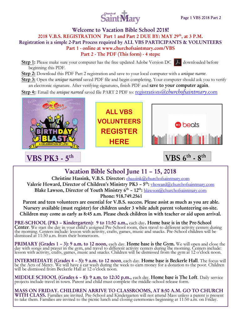 Page 1 VBS 2018 Part 2Welcome to Vacation Bible School 2018!2018 V.B.S. REGISTRATION Part 1 and Part 2 DUE BY: MAY 29th, at 3 P.M. Registration is a simple 2Part Process required by ALL VBS PARTICIPANTS