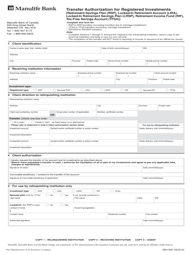 Transfer Authorization for Registered Investments (Retirement Savings Plan (RSP), Locked In Retirement Account (LIRA), Locked In Retirement Savings Plan (LSP), Retirement Income Fund (RIF), Three