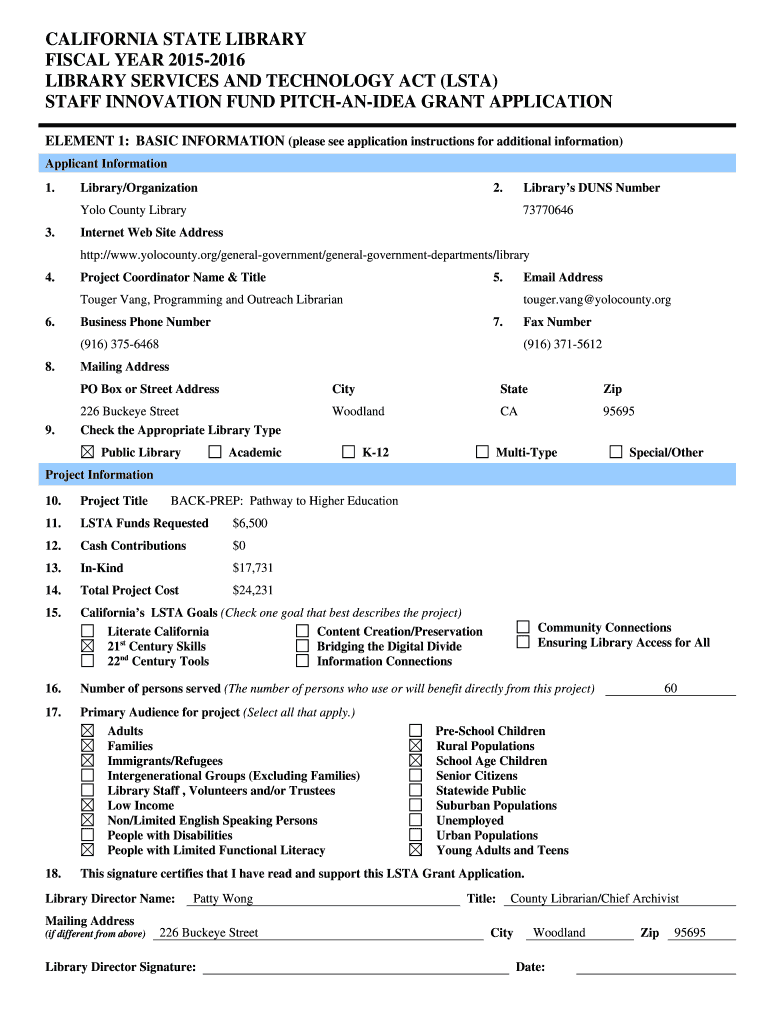 CALIFORNIA STATE LIBRARY FISCAL YEAR 20152016 LIBRARY SERVICES AND TECHNOLOGY ACT (LST) STAFF INNOVATION FUND PITCHANIDEA GRANT APPLICATION ELEMENT 1: BASIC INFORMATION (please see application instructions