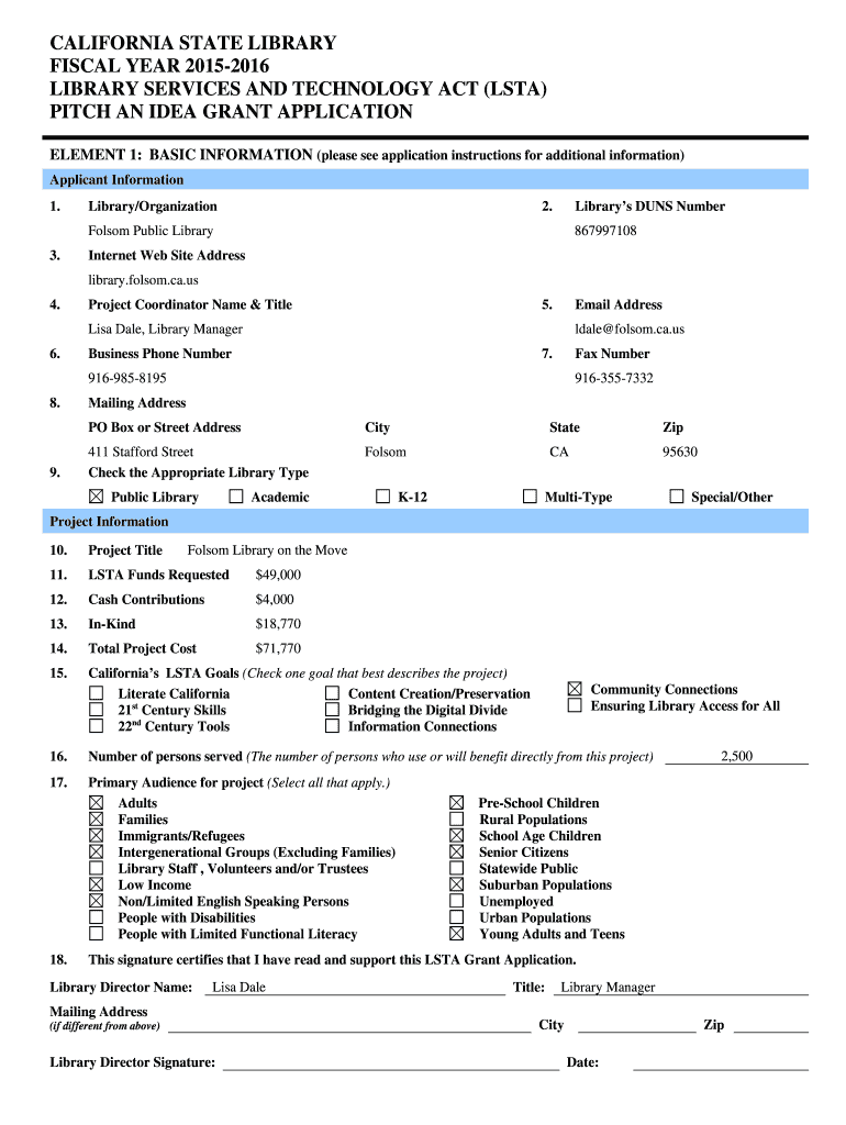 CALIFORNIA STATE LIBRARY FISCAL YEAR 20152016 LIBRARY SERVICES AND TECHNOLOGY ACT (LST) PITCH AN IDEA GRANT APPLICATION ELEMENT 1: BASIC INFORMATION (please see application instructions for additional