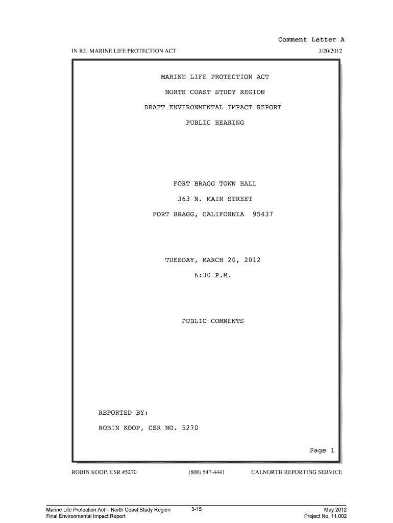 Comment Letter A IN RE MARINE LIFE PROTECTION ACT3/20/2012MARINE LIFE PROTECTION ACT NORTH COAST STUDY REGION DRAFT ENVIRONMENTAL IMPACT REPORT PUBLIC HEARINGFORT BRAGG TOWN HALL 363 N. MAIN STREET