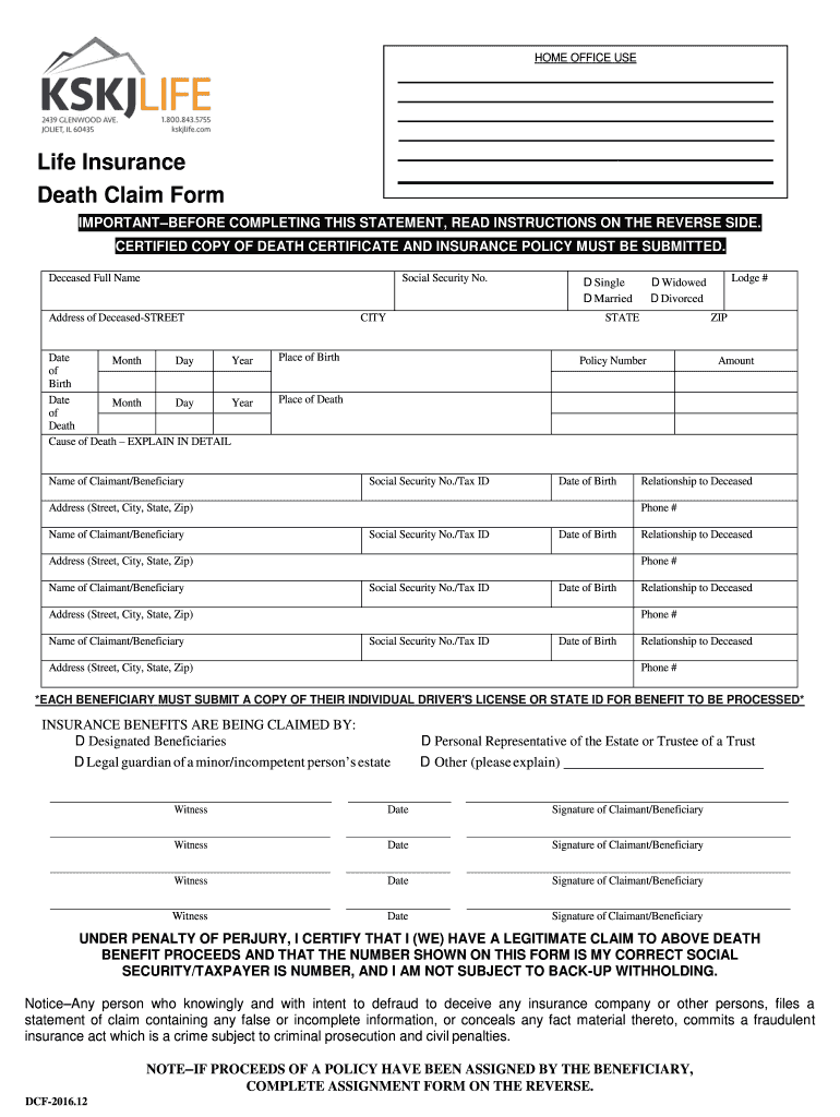 Get the free Life Insurance Death Claim Form - KSKJ Life
