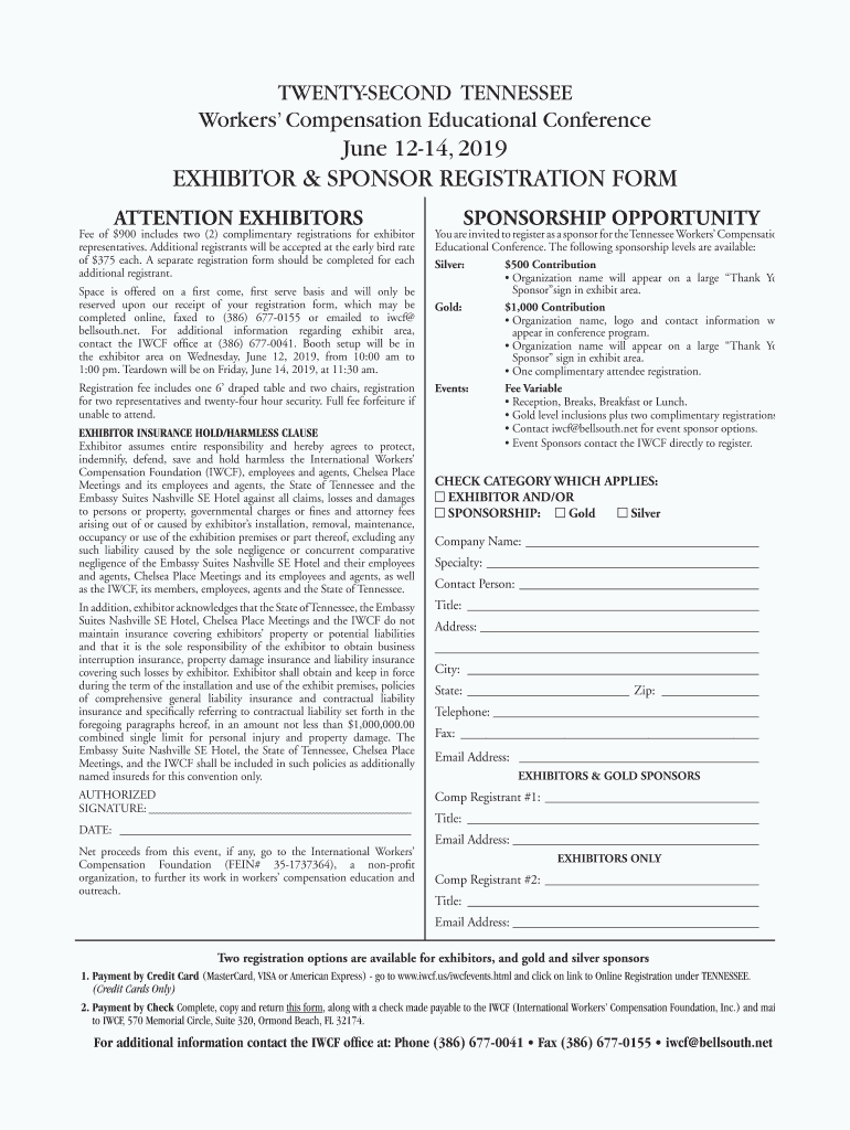 TWENTYSECOND TENNESSEE Workers Compensation Educational Conference June 1214, 2019EXHIBITOR & SPONSOR REGISTRATION FORM ATTENTION Exhibitors of $900 includes two (2) complimentary registrations for