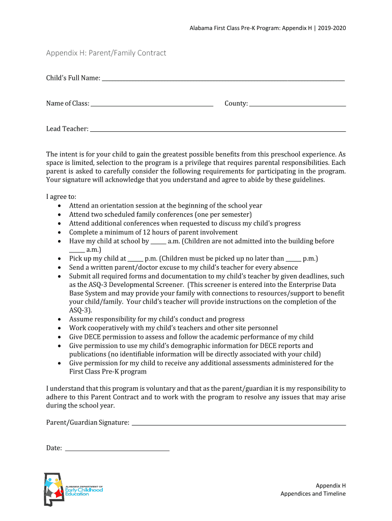 Alabama First Class Prey Program: Appendix H 20192020Appendix H: Parent/Family Contract Child's Full Name: Name of Class: County: Lead Teacher: The intent is for your child to gain the greatest possible