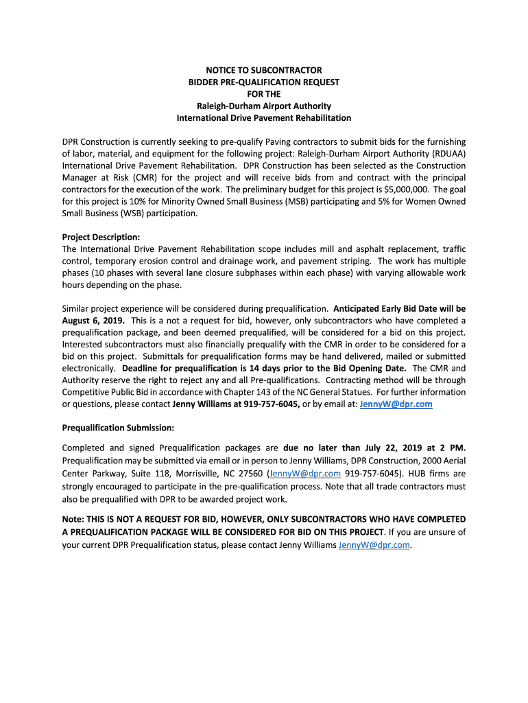 Get the free Notice To Subcontractor Bidder Pre-Qualification Request For ...