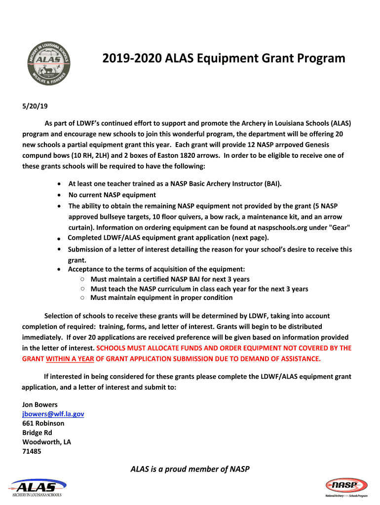 20192020 ALAS Equipment Grant Program5/20/19 As part of Laws continued effort to support and promote the Archery in Louisiana Schools (ALAS) program and encourage new schools to join this wonderful