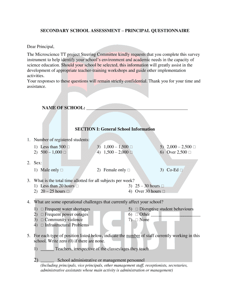 SECONDARY SCHOOL ASSESSMENT PRINCIPAL QUESTIONNAIREDear Principal, The Microscience TT project Steering Committee kindly requests that you complete this survey instrument to help identify your schools