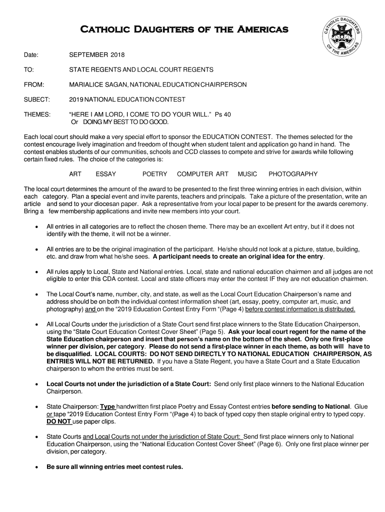 Date:SEPTEMBER 2018TO:STATE REGENTS AND LOCAL COURT REGENTSFROM:MARITIME SAGAN, NATIONAL EDUCATION CHAIRPERSONSUBECT:2019 NATIONAL EDUCATION CONTESTTHEMES:HERE I