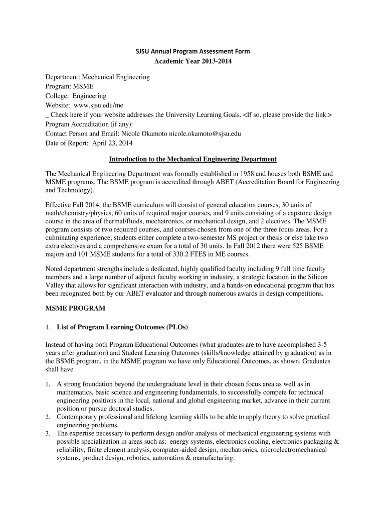 JSU Annual Program Assessment Form Academic Year 20132014 Department: Mechanical Engineering Program: MSME College: Engineering Website: www.sjsu.edu/me Check here if your website addresses the University