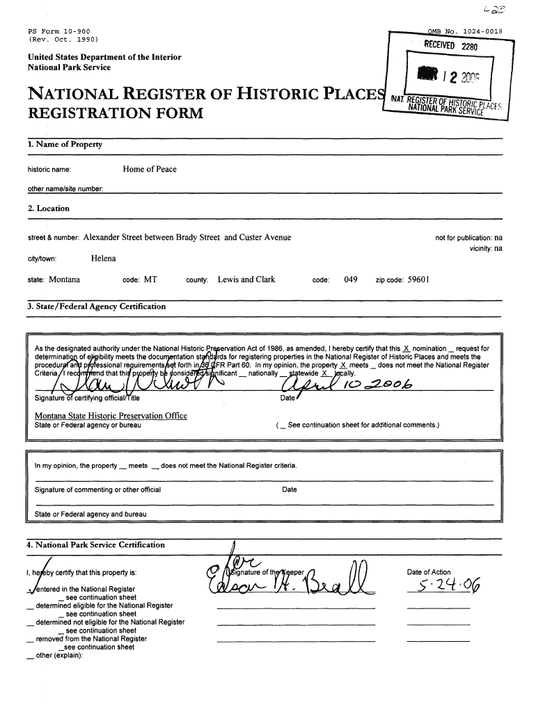Jo. 10240018PS Form 10900 (Rev. Oct. 1990)RECEIVED 2280United States Department of the Interior National Park ServiceNATIONAL REGISTER OF HISTORIC PLACE REGISTRATION FORM 1. Name of PropertyHome of