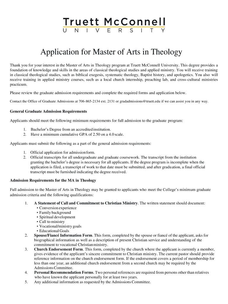 Get the free Application for Master of Arts in Theology - Truett McConnell ...