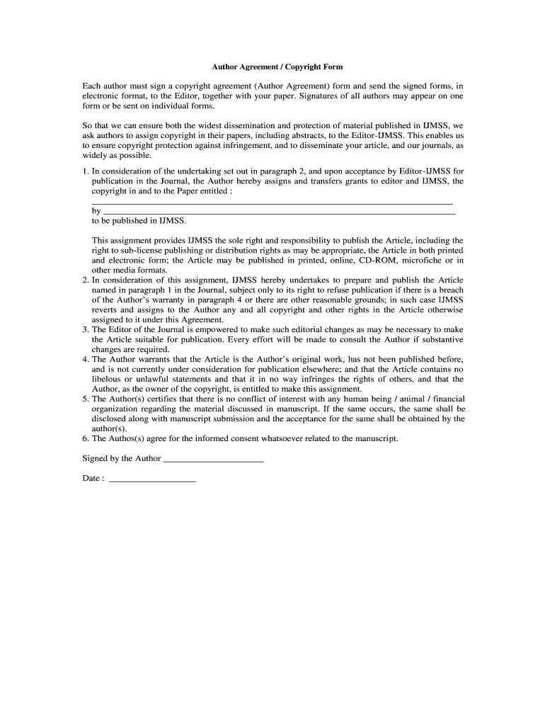 Author Agreement / Copyright Former author must sign a copyright agreement (Author Agreement) form and send the signed forms, in