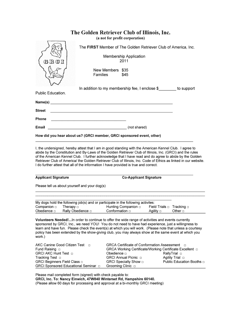 The Golden Retriever Club of Illinois, Inc. (a not for profit corporation) The FIRST Member of The Golden Retriever Club of America, Inc. Membership Application 2011 New Members $35 Families $45 In