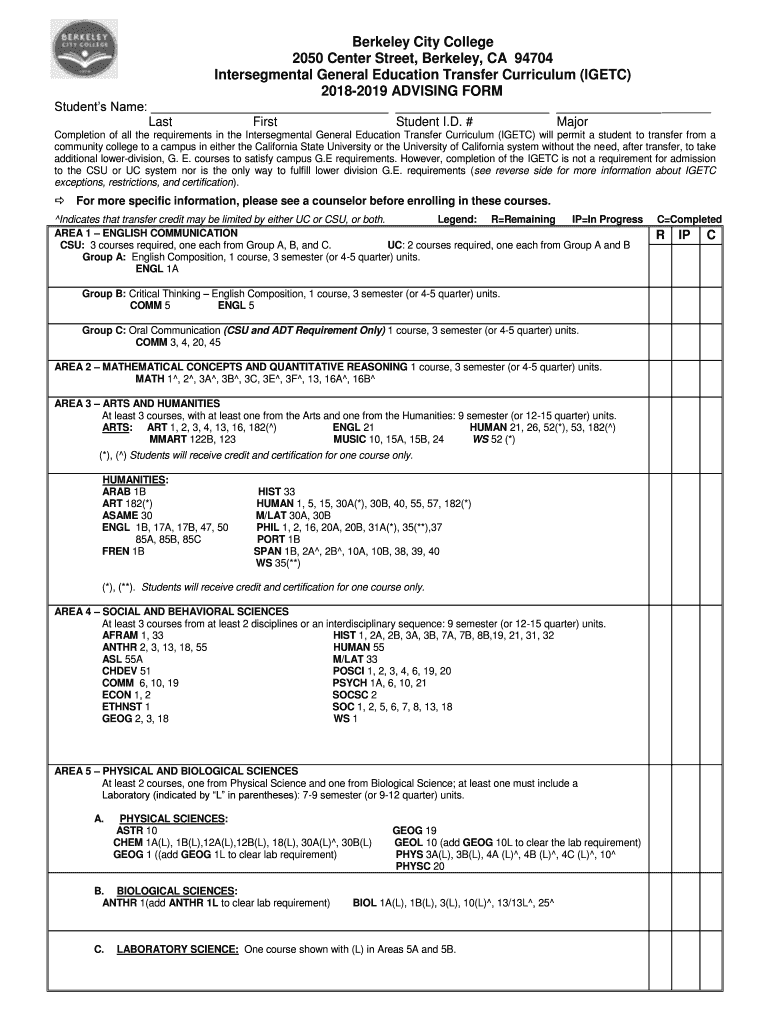 Berkeley City College 2050 Center Street, Berkeley, CA 94704 Intersegmental General Education Transfer Curriculum (IGE TC) 20182019 ADVISING FORM Students Name: Last First Student I.D. # Major Completion