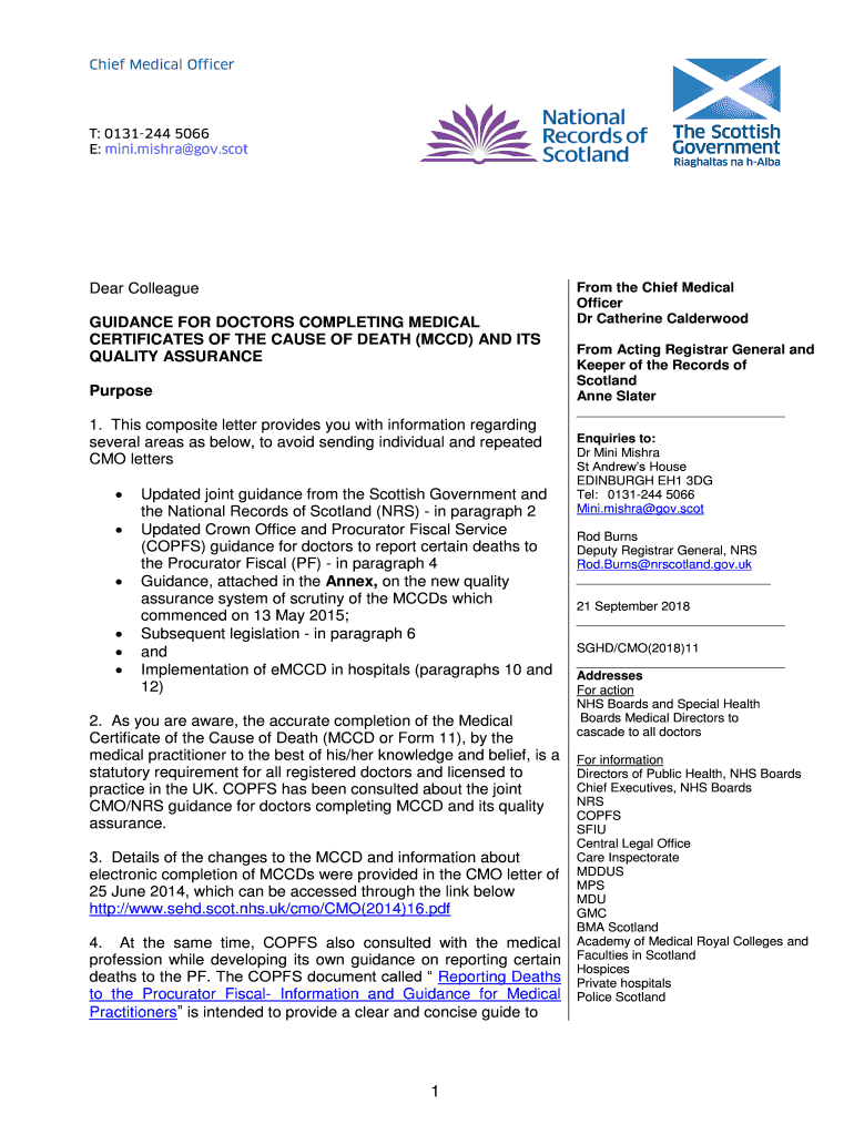 Chief Medical Officer: 0131244 5066 E: mini. Mishra gov. Soldier Colleague GUIDANCE FOR DOCTORS COMPLETING MEDICAL CERTIFICATES OF THE CAUSE OF DEATH (CCD) AND ITS QUALITY ASSURANCE Purposeful the