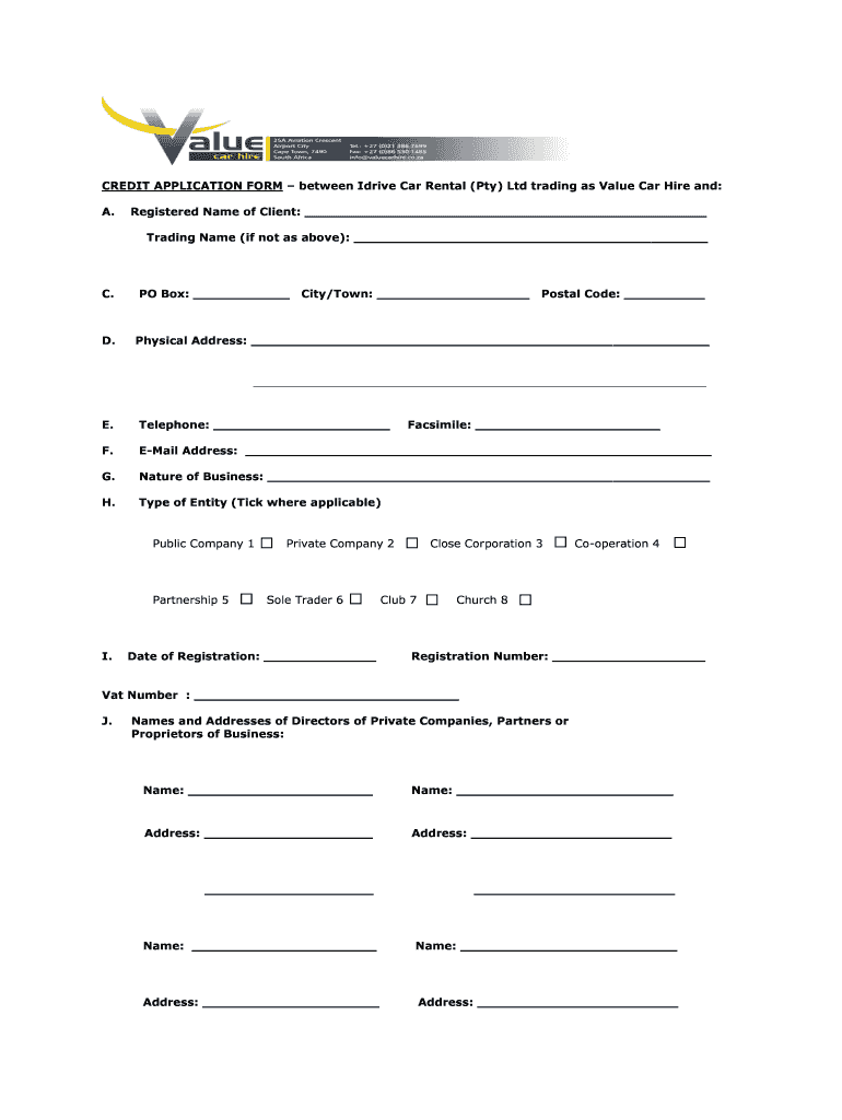 CREDIT APPLICATION FORM between Drive Car Rental (Pty) Ltd trading as Value Car Hire and: A. Registered Name of Client: Trading Name (if not as above): C.D.PO Box: City/Town: Postal Code: Physical