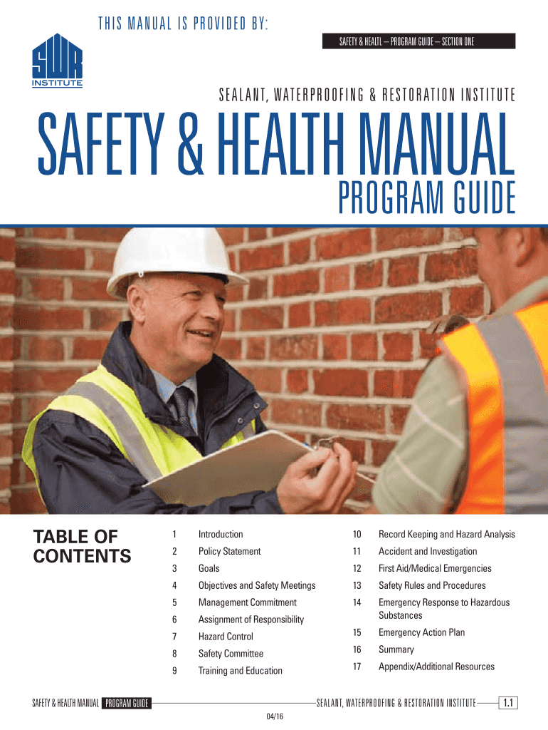 T HIS MANUAL IS PROVIDED BY: SAFETY & HEALTH PROGRAM GUIDE SECTION ONE SEA LA NT, WAS ER PRO OF ING & REST O RAT IO N IN STITUTESAFETY & HEALTHPROGRAM MANUAL SUITABLE OF CONTENTS1Introduction10Record