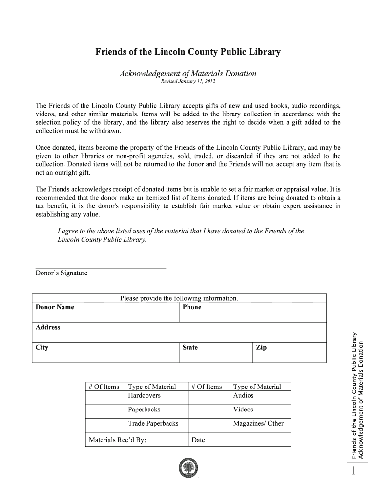 Revised January 11, 2012The Friends of the Lincoln County Public Library accepts gifts of new and used books, audio