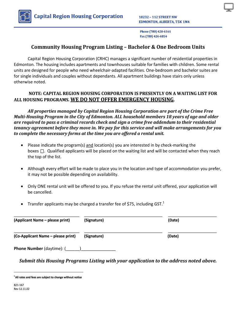 The Community Housing Program Application is a crucial document used by individuals and couples without dependents seeking to secure affordable bachelor and one-bedroom units managed by the Capital Region Housing Corporation in Edmonton, Alberta.