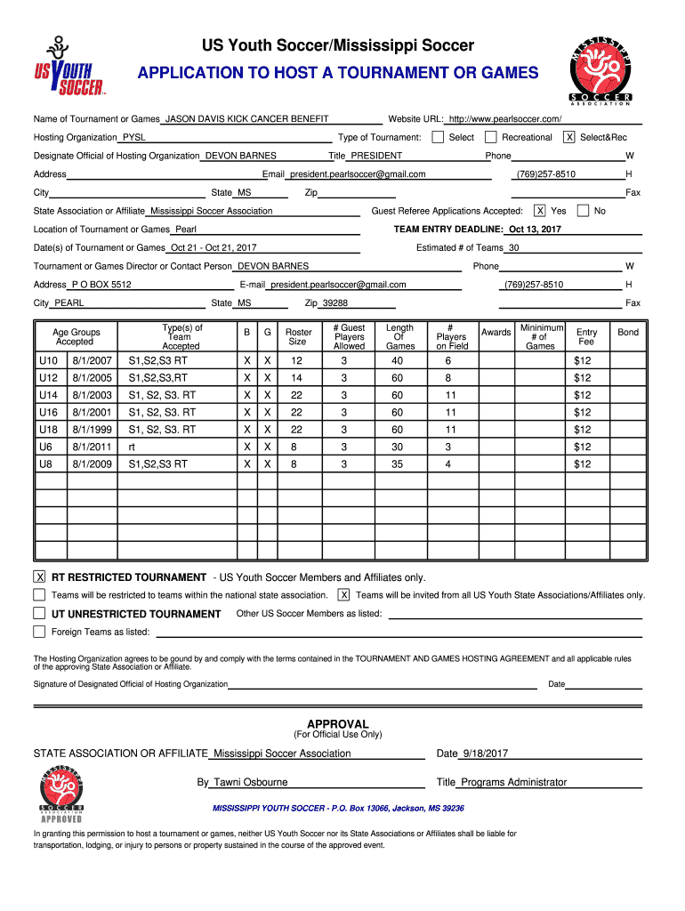 APPLICATION TO HOST A TOURNAMENT OR GAMES