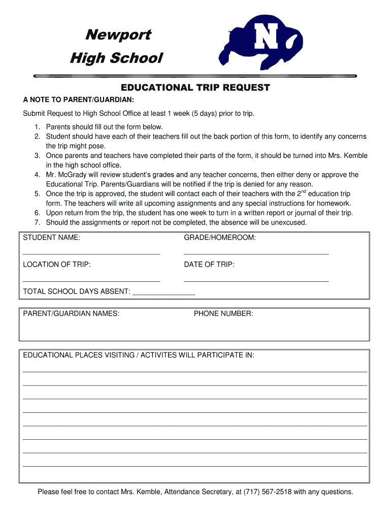 Submit Request to High School Office at least 1 week (5 days) prior to trip.