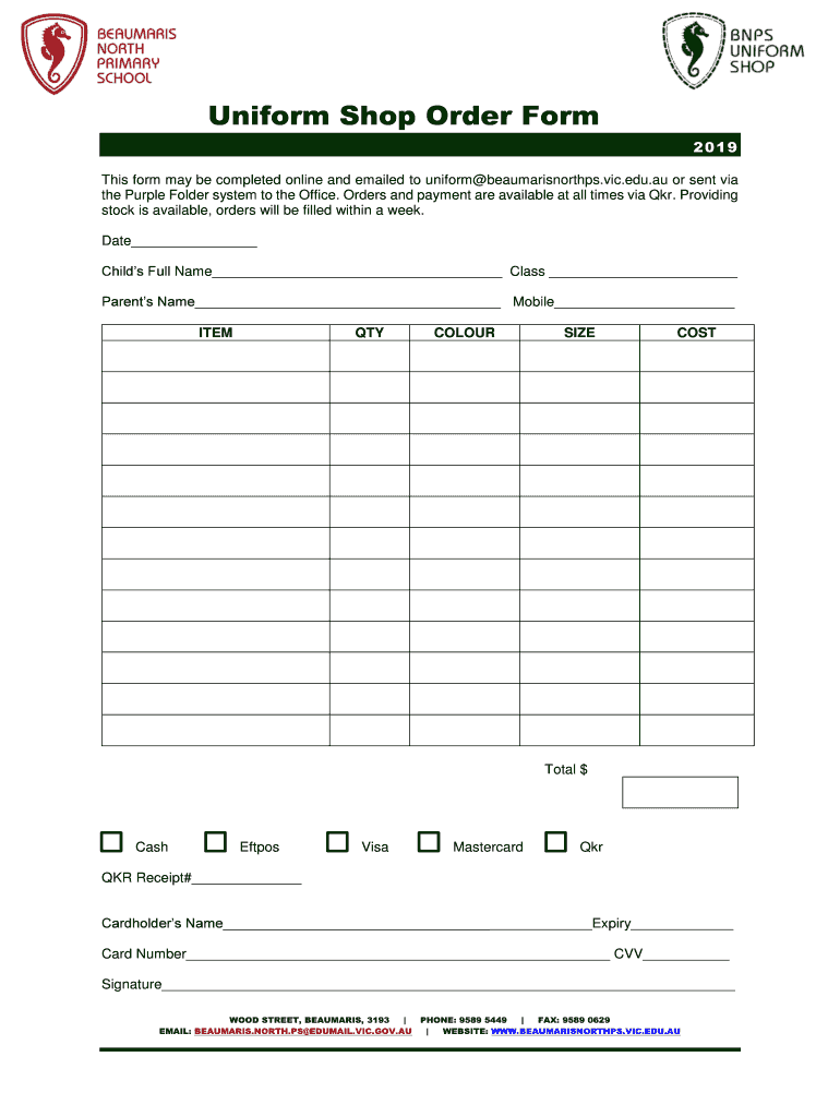Uniform Shop Order Form 2019 This form may be completed online and emailed to uniform beaumarisnorthps.Vic.edu.AU or sent via the Purple Folder system to the Office. Orders and payment are available