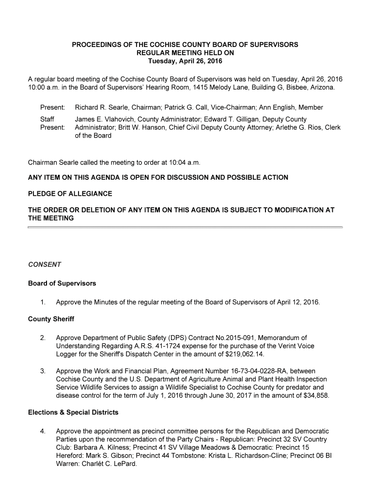PROCEEDINGS OF THE COCHISE COUNTY BOARD OF SUPERVISORS