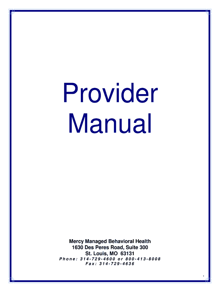 Provider ManualMercy Managed Behavioral Health 1630 DES Pairs Road, Suite 300 St. Louis, MO 63131 Phone: 3147294600 or 8004138008 Fax: 3147294636 1Table of Contents Welcome Letter .3Foreword .4MMBH