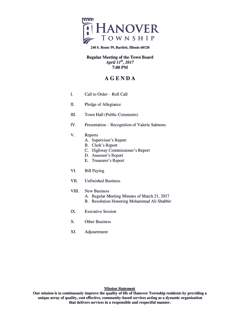 240 S. Route 59, Bartlett, Illinois 60120Regular Meeting of the Town Board April 11th, 2017 7:00 AGENDA I. Call to Order Roll Callie. Pledge of Allegiance. Town Hall (Public Comments)IV. Presentation