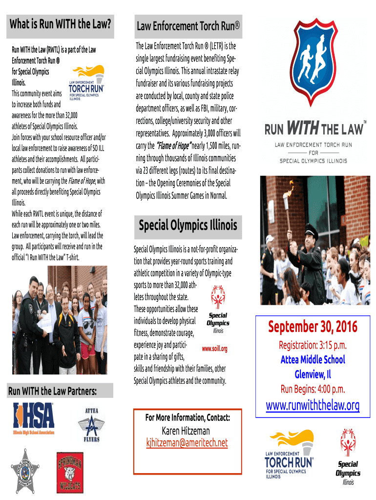 What is Run WITH the Law? Law Enforcement Torch Rerun WITH the Law (RTL) is a part of the Law Enforcement Torch Run for Special Olympics Illinois. This community event aims to increase both funds