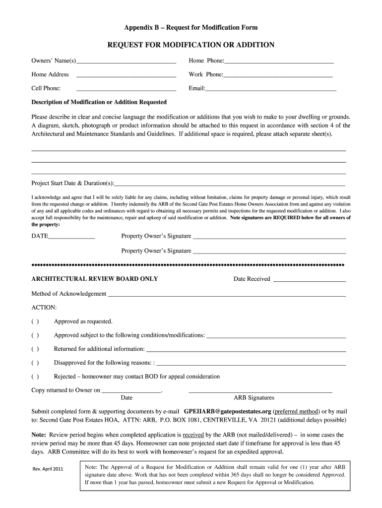 Appendix B Request for Modification FormREQUEST FOR MODIFICATION OR ADDITION Owners Name(s) Home Phone: Home Address Work Phone: Cell Phone: Email: Description of Modification or Addition Requested