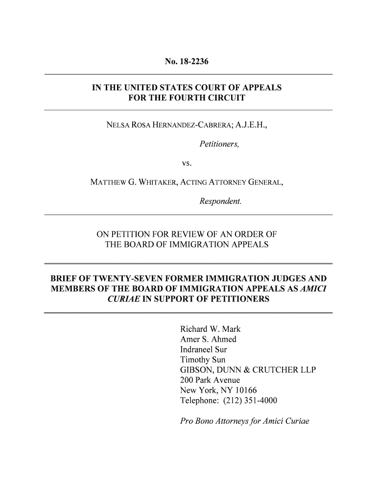 No. 182236 IN THE UNITED STATES COURT OF APPEALS FOR THE FOURTH CIRCUIT ELSA ROSA HERNANDEZCABRERA; A.J.E.H., Petitioners, vs. MATTHEW G. WHITAKER, ACTING ATTORNEY GENERAL, Respondent. ON PETITION