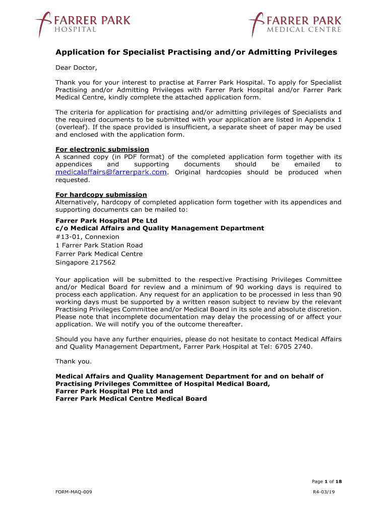 Thank you for your interest to practice at Farmer Park Hospital. To apply for Specialist