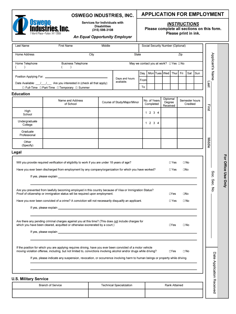 APPLICATION FOR EMPLOYMENTOSWEGO INDUSTRIES, INC. Services for Individuals with Disabilities (315) 5983108INSTRUCTIONS Please complete all sections on this form. Please print in ink. An Equal Opportunity