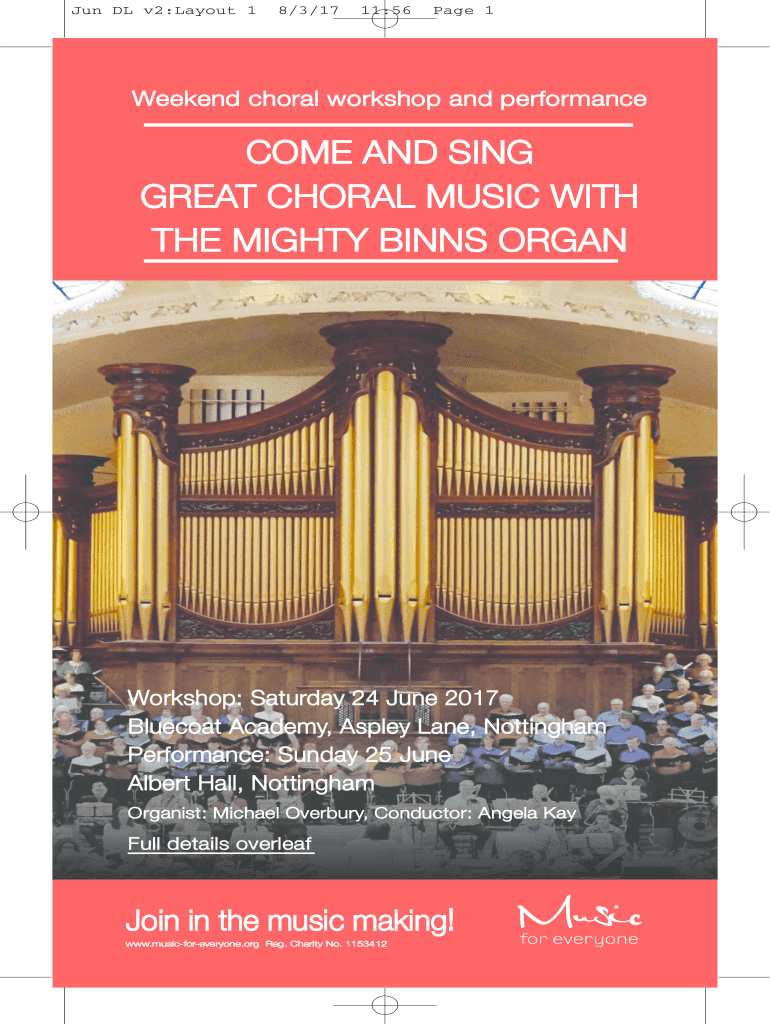 Jun DL v2:Layout 18/3/1711:56Page 1W e k end c h o r an l w o r k s ho p an n d p e r f o r m a NC eCO M E A N D S I NG GREAT CHORAL MUSIC WITH The M I G H T Y B I IN S O R G A Two r k s h o p : S