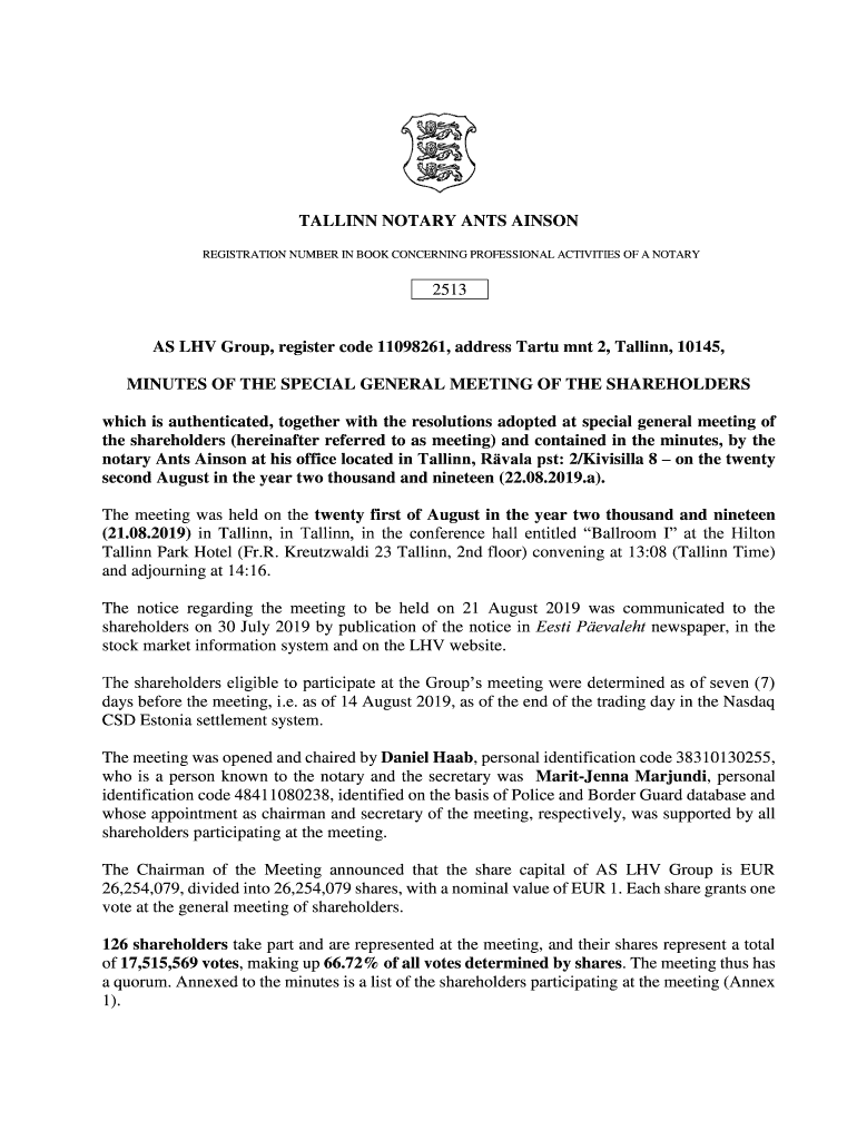 REGISTRATION NUMBER IN BOOK CONCERNING PROFESSIONAL ACTIVITIES OF A NOTARY2513AS LHV Group, register code 11098261, address Tart MNT 2, Tallinn, 10145,