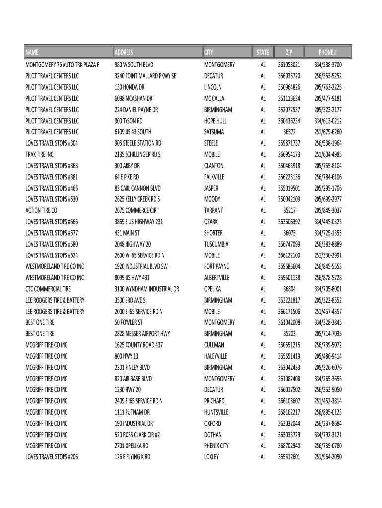 NAMEADDRESSCITYMONTGOMERY 76 AUTO TRY PLAZA F PILOT TRAVEL CENTERS LLC PILOT TRAVEL CENTERS LLC PILOT TRAVEL CENTERS LLC PILOT TRAVEL CENTERS LLC PILOT TRAVEL CENTERS LLC PILOT TRAVEL CENTERS LLC