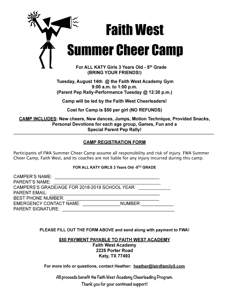 Faith West Summer Cheer Camp! For ALL KATY Girls 3 Years Old 5th Grade (BRING YOUR FRIENDS!)!Tuesday, August 14th the Faith West Academy Gym 9:00 a.m. to 1:00 p.m. (Parent Pep RallyPerformance Tuesday