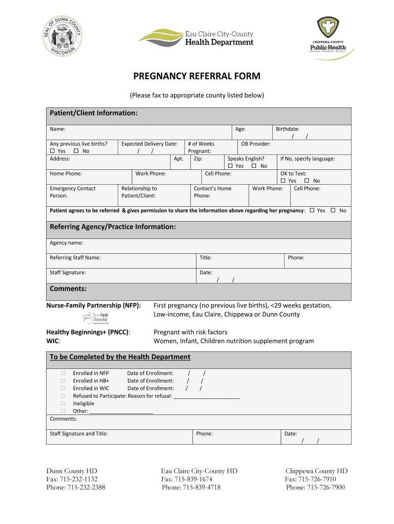 PREGNANCY REFERRAL FORM (Please fax to appropriate county listed below)Patient/Client Information: Name: Any previous live births? Yes No Address:Age: Expected Delivery Date: # of Weeks / / Pregnant: