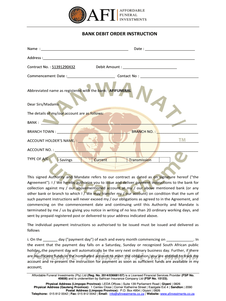 BANK DEBIT ORDER INSTRUCTION Name : Date : Address : Contract No. 51391290432Debit Amount : Commencement Date : Contact No : Abbreviated name as registered with the bank: FUNERAL Dear Sirs/Madams