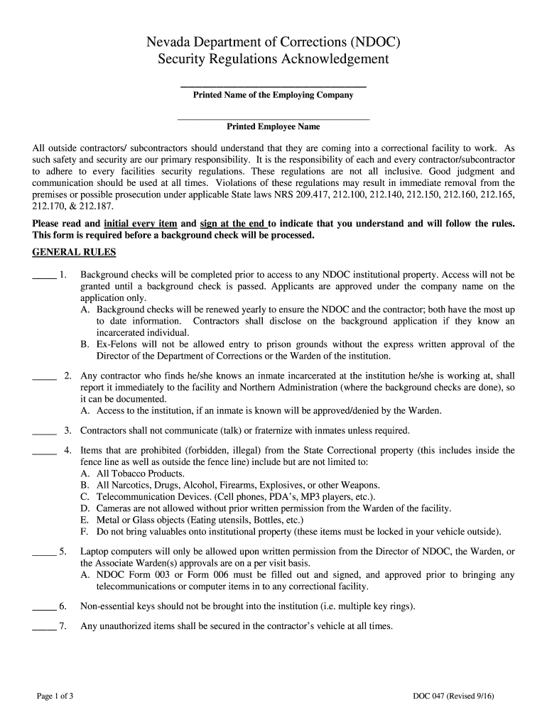 Nevada Department of Corrections (DOC) Security Regulations Acknowledgement Printed Name of the Employing Company Printed Employee Namely outside contractors/ subcontractors should understand that