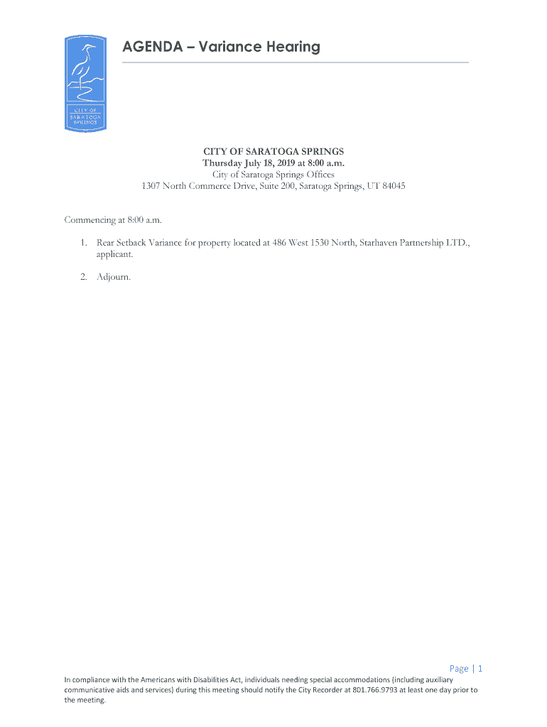 AGENDA Variance Veracity OF SARATOGA SPRINGS Thursday, July 18, 2019, at 8:00 a.m. City of Saratoga Springs Offices 1307 North Commerce Drive, Suite 200, Saratoga Springs, UT 84045 Commencing at 8:00