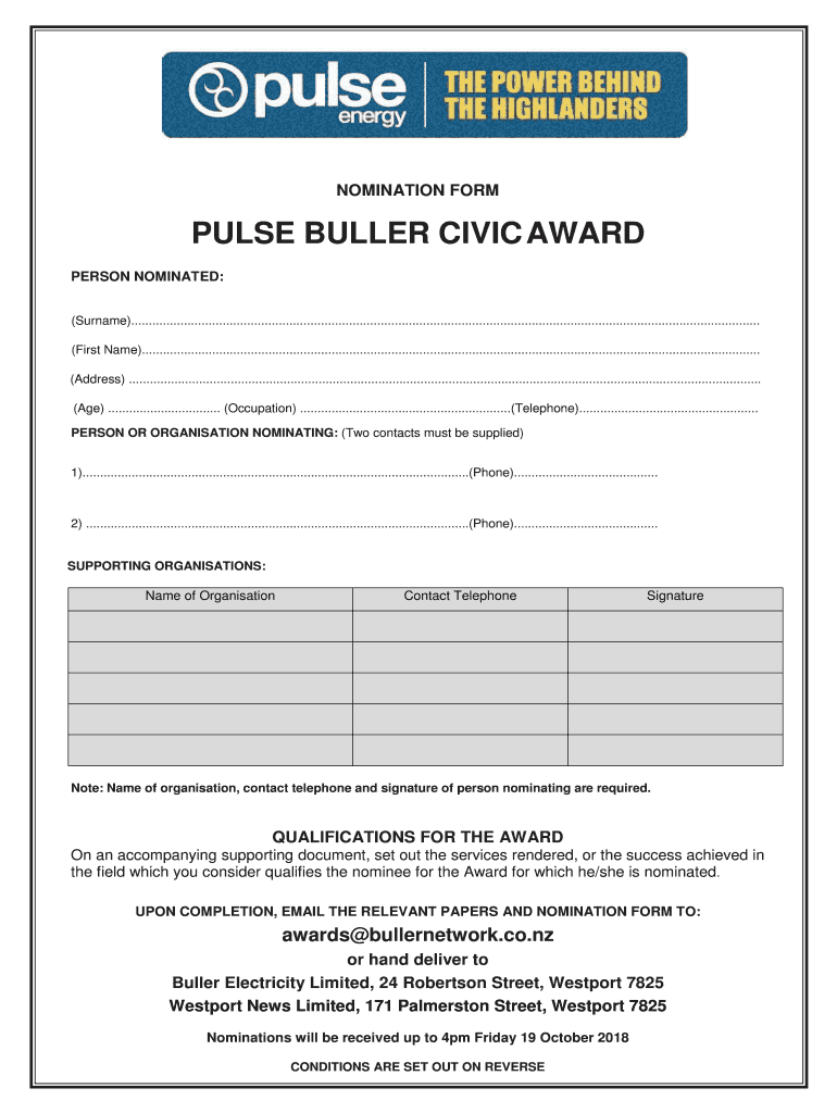 Get the free Pulse Buller Civic Award Nomination Form 2018